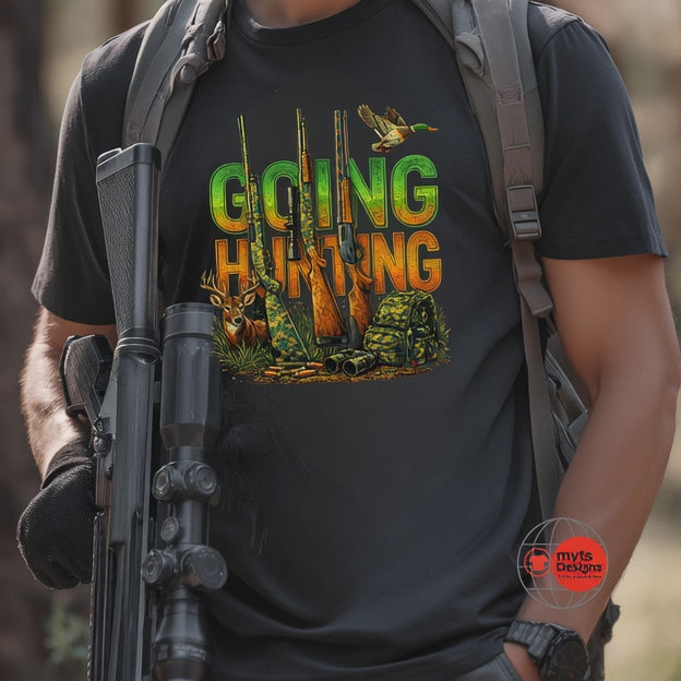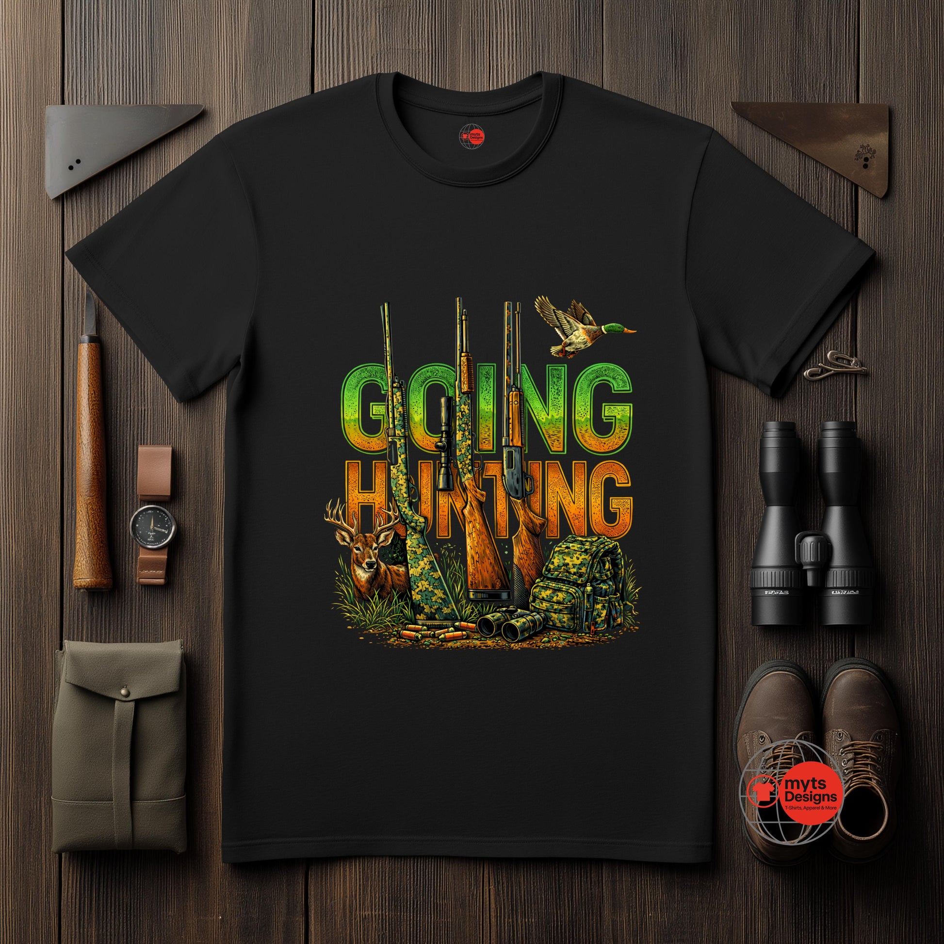 Featuring a bold hunting-themed graphic with rifles, wildlife, gear, and woodland elements, this design captures the true spirit of the hunt—strong, focused, and unapologetically rugged.